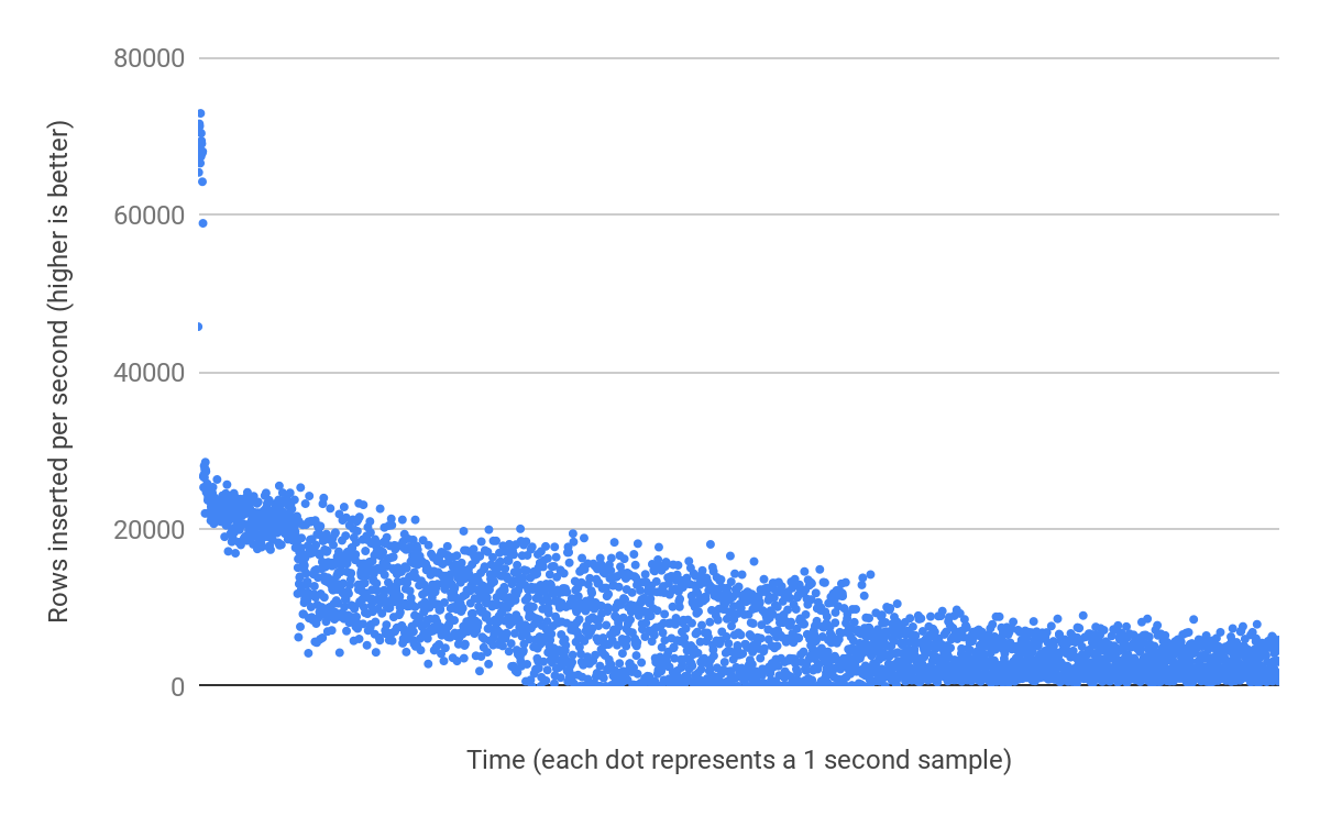 .. they look almost identical right? Lets try and insert rows into them in 32 parallel threads for one hour: